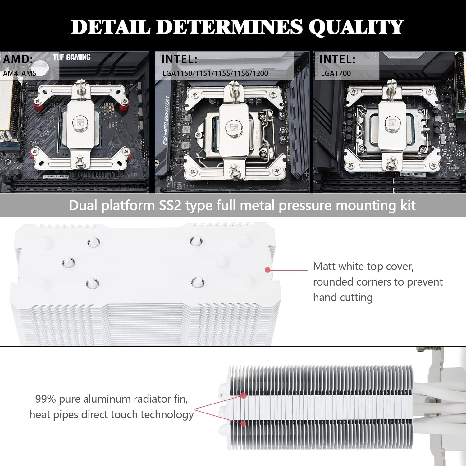 مزود بـ مروحة TL-C12CW-S بحجم 120 ملم وتقنية PWM مع S-FDB (تحمل ديناميكي مائي مغلق)، يوفر هذا المبرد تدفق هواء عالي (66.17 CFM) وضوضاء منخفضة (25.6 ديسيبل). كما أن إضاءة ARGB القابلة للعنونة متوافقة مع برامج RGB الرئيسية للوحة الأم، لتضيف لمسة جمالية لأي بناء جهاز حديث أو أبيض اللون.