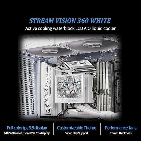 يتميز ستريم فيجن 360 الأبيض بمبادل حراري من الألمنيوم عالي الكفاءة وثلاثة مراوح PWM من نوع TL‑H12W‑X28‑R7 توفر تدفق هواء قوي وضغط ثابت مثالي لمعالجات CPU عالية الأداء. كما يدعم المضخة سرعات تصل إلى 6400 RPM، وتحتوي على شاشة LCD حيوية 3.5 بوصة يمكن عرض إحصاءات النظام، الرسومات المخصصة، أو الرسوم المتحركة الديناميكية عليها.