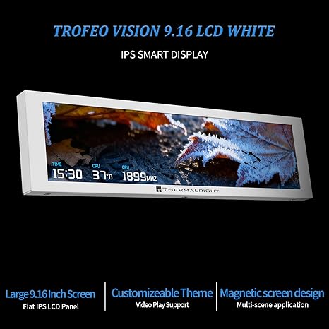 شاشة Thermalright Trofeo Vision مقاس 9.16 بوصة باللون الأبيض هي لوحة عرض ملونة بالكامل مصممة لعشاق الكمبيوتر ومن يقومون بتخصيص أجهزتهم. تتميز بشاشة واسعة للغاية بمقاس 9.16 بوصة ودقة 1920×480، لتقديم صور واضحة وألوان زاهية وزوايا مشاهدة واسعة.