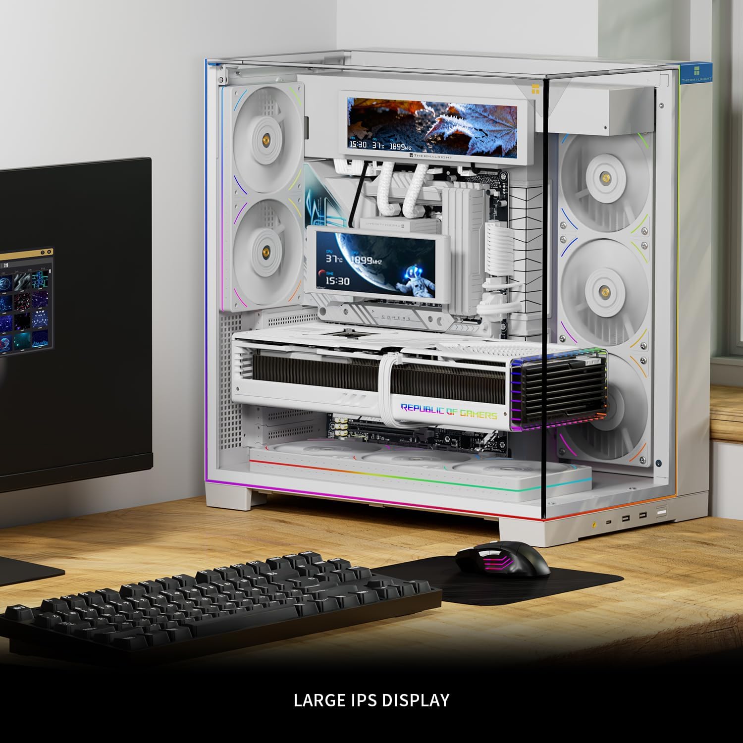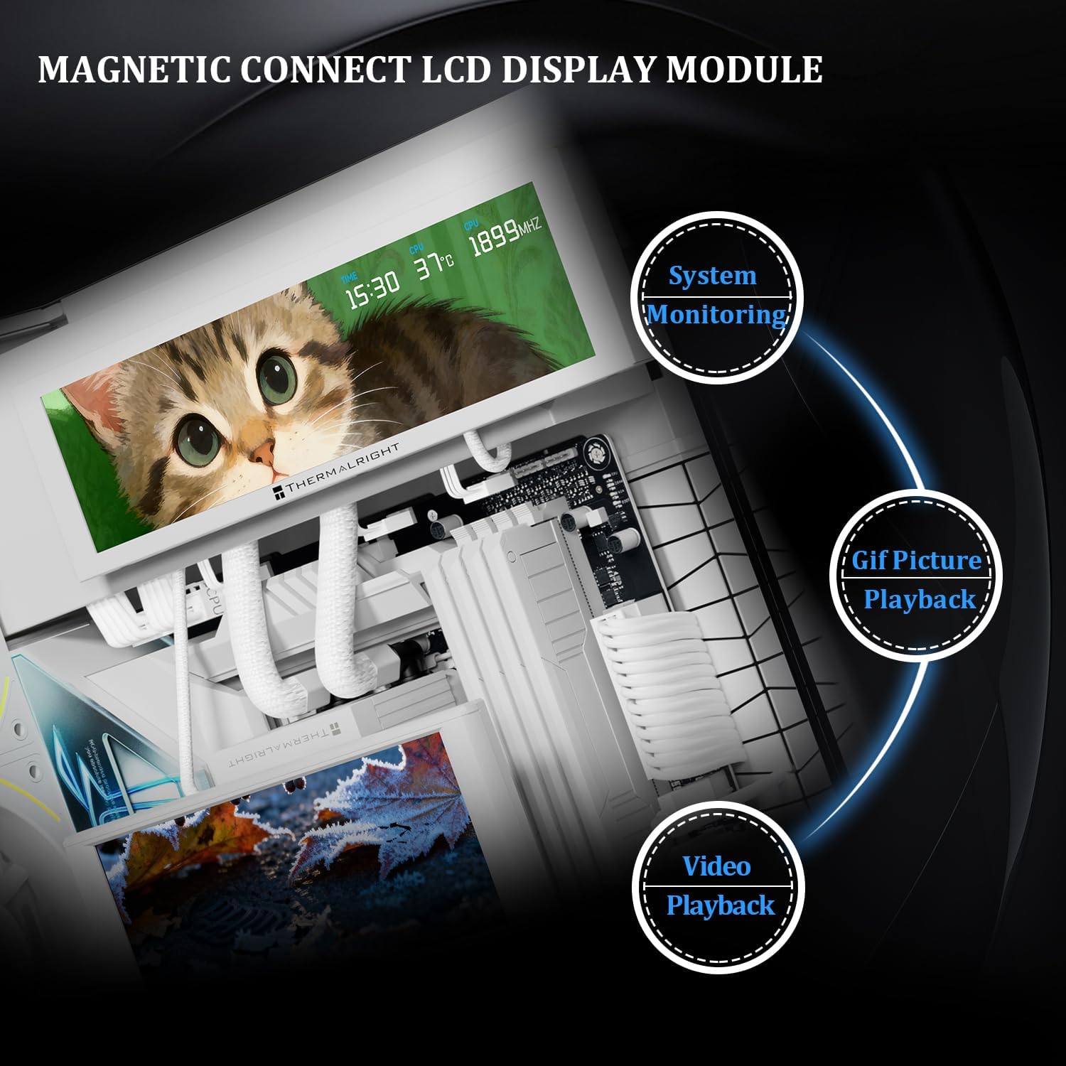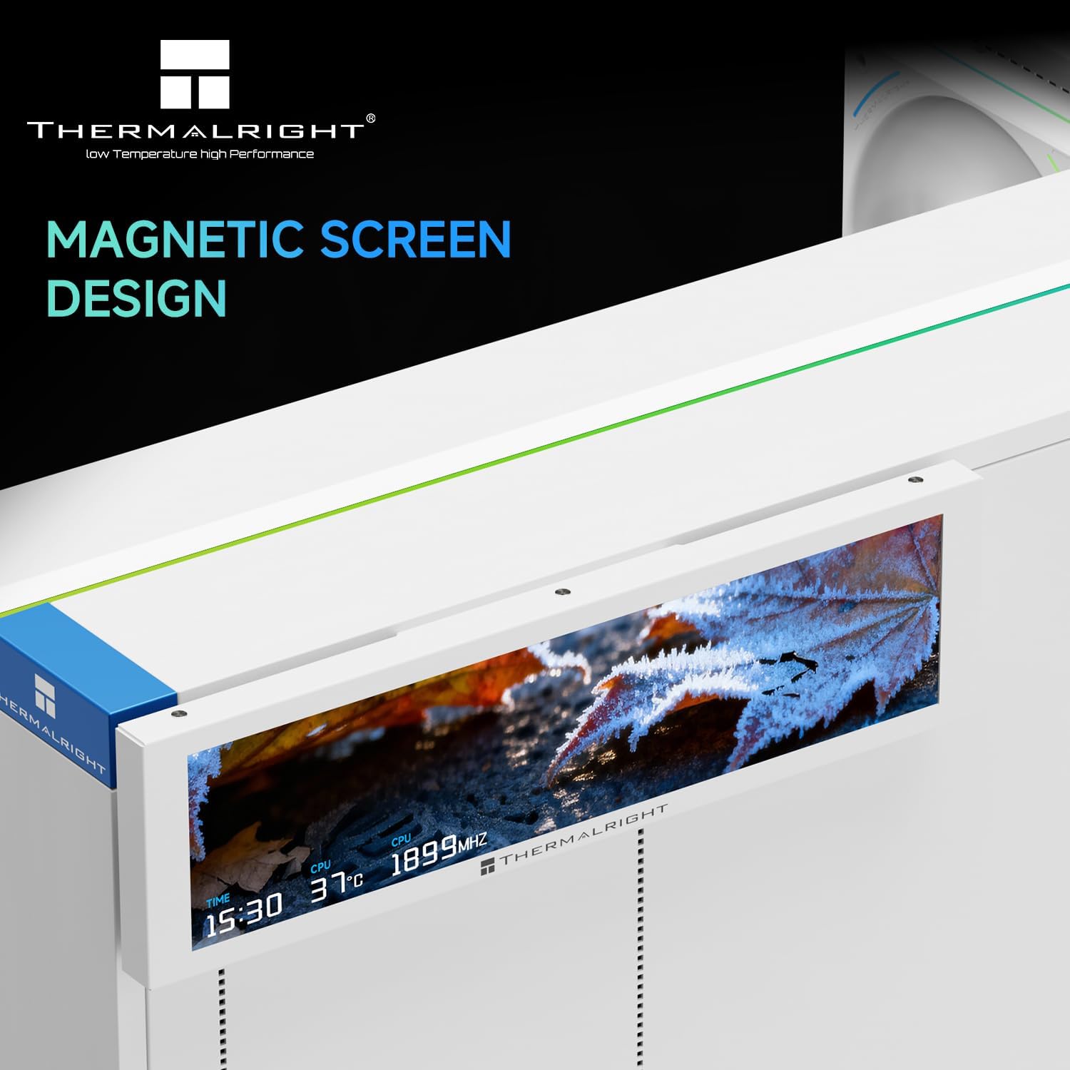 يتيح لك نظام التثبيت المغناطيسي وضع الشاشة داخل أو خارج الصندوق بحرية، بينما يوفر توصيل USB‑C الطاقة والبيانات بسهولة. باستخدام برنامج Thermalright، يمكنك متابعة درجات حرارة المعالج ووحدة معالجة الرسوميات، وسرعات المروحة، وترددات الساعة وغيرها من إحصاءات النظام في الوقت الفعلي.