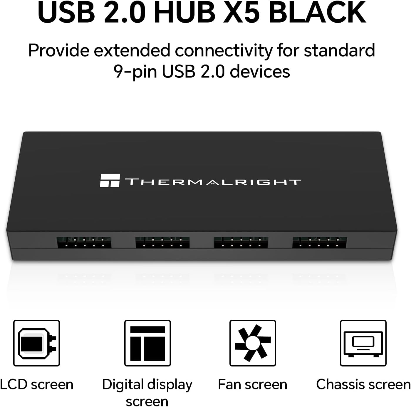 هاب Thermalright USB 2.0 HUB X5 هو وحدة توسيع USB داخلية عالية الجودة مصممة لعشاق الحواسيب الذين يحتاجون إلى المزيد من منافذ الاتصال. يحوّل هذا الهاب منفذ USB 9‑بن واحد على اللوحة الأم إلى خمسة منافذ USB 2.0 إضافية، مما يجعله مثالياً لتوصيل وحدات تحكم RGB، وهاب المراوح، والشاشات الداخلية، وغيرها من الأجهزة الطرفية.
