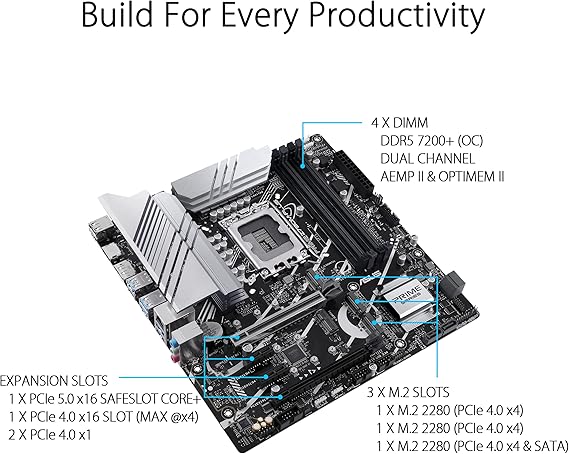 This motherboard features DDR5 memory support with enhanced tuning technologies such as ASUS OptiMem II and AEMP II, enabling higher frequencies and improved system stability. The PCIe 5.0 x16 slot ensures full compatibility with next-generation graphics cards, while three PCIe 4.0 M.2 slots provide ultra-fast NVMe storage performance.