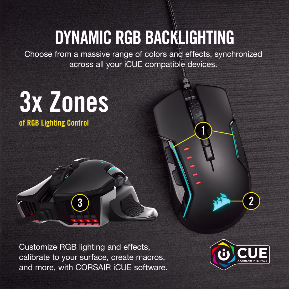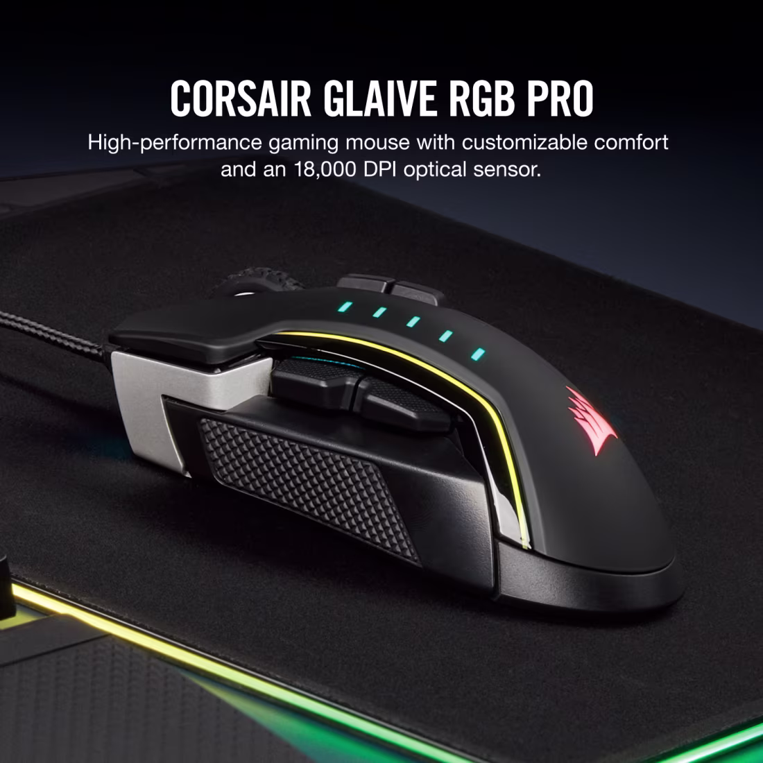 The Corsair Glaive RGB Pro Wired Gaming Mouse is engineered for gamers who demand precision, speed, and comfort. Equipped with a high-performance optical sensor, it delivers accurate and responsive tracking for competitive gaming and everyday use. The customizable RGB lighting allows you to personalize your setup and match your gaming rig.