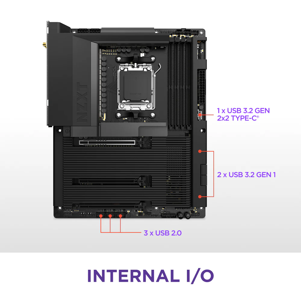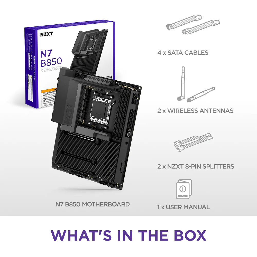 The NZXT N7 B850 Black (N7-B85XT-B1) is a premium ATX motherboard for AMD AM5 processors, supporting Ryzen 7000, 8000, and 9000 series CPUs. It features DDR5 memory support, PCIe 5.0, multiple M.2 slots, Wi-Fi 6E, and 2.5GbE LAN. With a powerful VRM design and sleek full-black metal cover with integrated RGB control, it delivers high performance and a clean, modern aesthetic for gaming and professional PC builds.