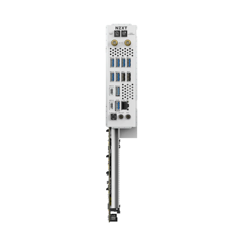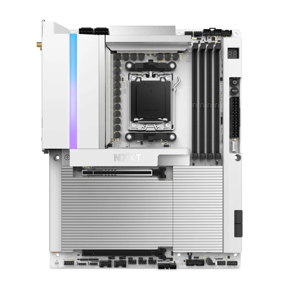 The NZXT N9 X870E White (N9-X87XT-W1) is a premium ATX motherboard for AMD AM5 processors, featuring a powerful VRM design, DDR5 memory support, PCIe 5.0, multiple M.2 slots, and advanced connectivity including Wi-Fi 7 and 5GbE LAN, all wrapped in a sleek white design with RGB lighting.