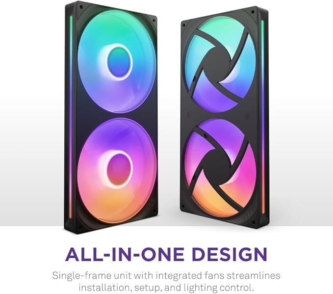 The NZXT F280 RGB Core (model RF‑U28HF‑B1) is a 280 mm single-frame RGB case fan unit designed to deliver efficient cooling and striking lighting for PC builds. It integrates two 140 mm PWM fans in a single frame, simplifying installation and reducing cable clutter compared to separate fans. Cooling Performance: Dual 140 mm PWM fans with speeds from 500 to 2,000 ± 200 RPM automatically adjust to system temperatures for efficient airflow and cooling. Each fan delivers up to 98.61 CFM of airflow and 3.2 mm H₂O static pressure, suitable for intake, exhaust, or radiator mounting. Fluid dynamic bearings provide a long lifespan (~60,000 hours) with quiet, stable operation. Anti-vibration rubber corners reduce noise, and Zero RPM mode can silence fans under light loads. Lighting & Control: Each fan features 8 individually addressable RGB LEDs for dynamic lighting effects. Includes an 8-pin combined PWM and RGB connector and a splitter cable for motherboard 5 V ARGB headers. Lighting and fan speed can be managed via NZXT CAM software when connected through a compatible NZXT controller (sold separately). Design & Compatibility: Integrated single-frame design simplifies mounting in cases with 280 mm fan/radiator support. Sleek black finish and RGB lighting enhance gaming and enthusiast PC builds. Includes necessary mounting screws and comes with a 5-year warranty. Summary: The RF‑U28HF‑B1 provides high-performance airflow, quiet operation, and customizable ARGB lighting, making it ideal for improving both the cooling and aesthetics of modern PC systems.