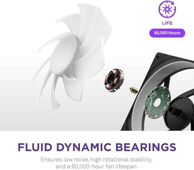 Equipped with a Fluid Dynamic Bearing, the fan operates smoothly with reduced friction, resulting in low noise levels even during extended use. This bearing technology also improves durability and ensures a long operational lifespan.