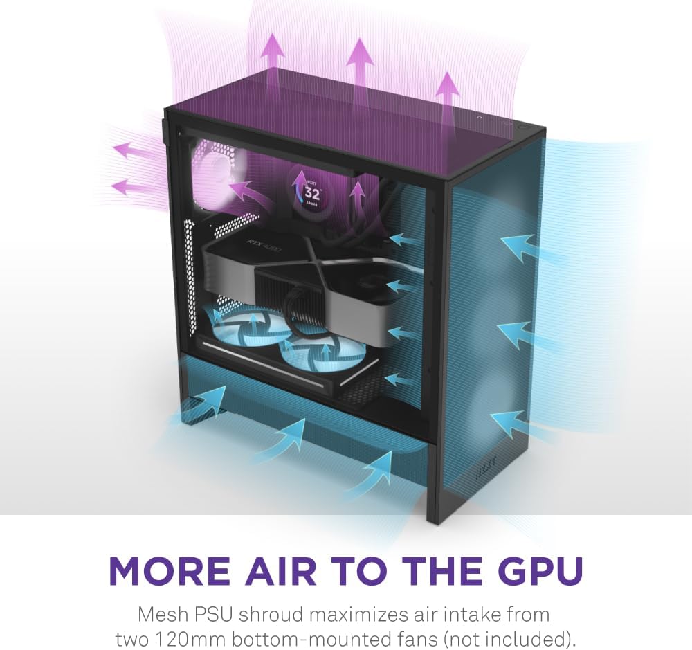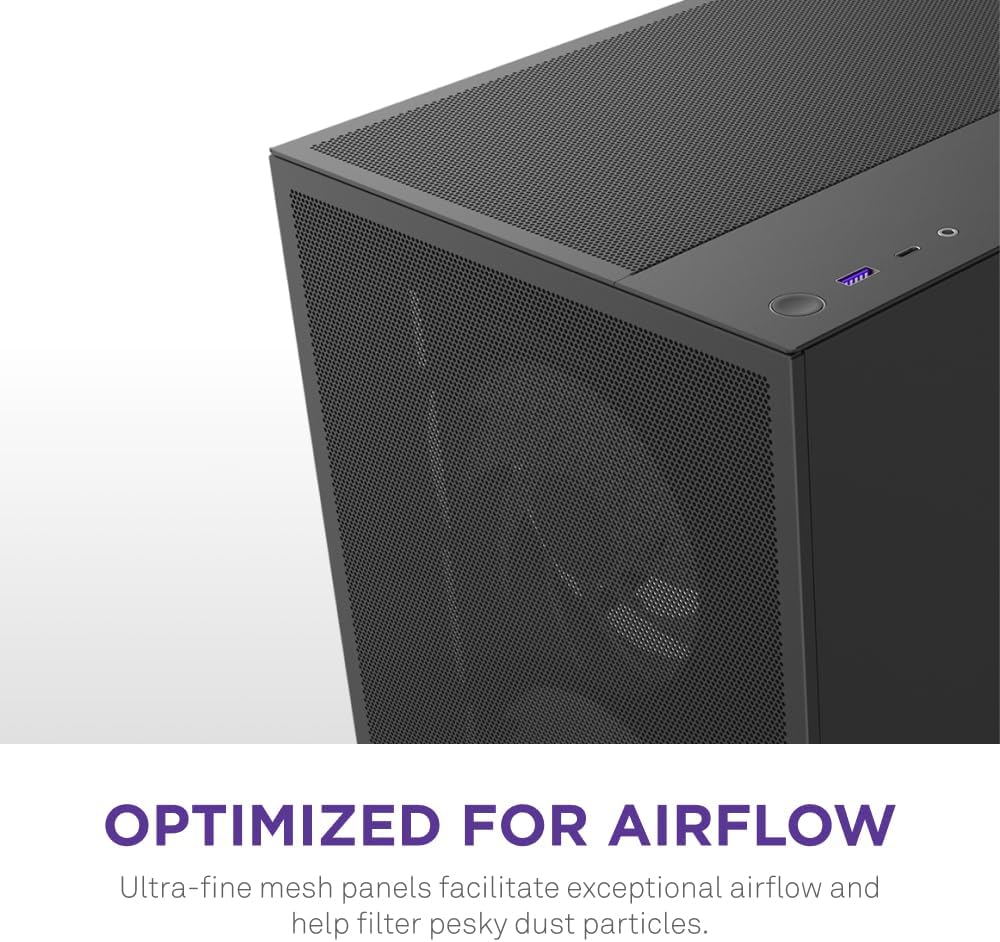 The case features a tempered glass side panel, allowing a clear view of internal components and RGB lighting, giving your setup a premium and clean appearance. Its high-airflow front design ensures efficient ventilation, helping to maintain optimal temperatures during intense gaming or heavy workloads.