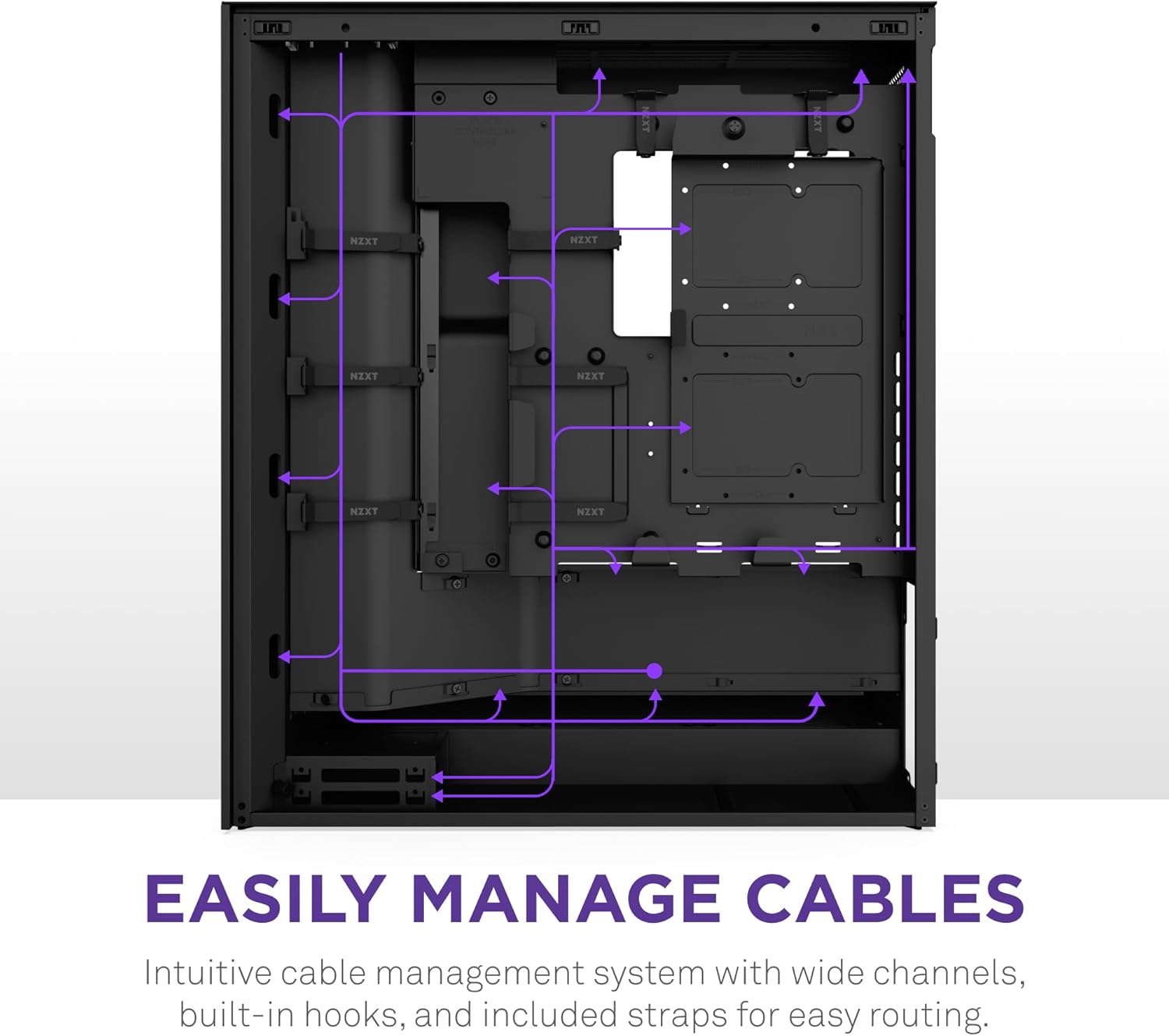Intuitive cable management system with wide routing channels, built-in hooks, and included straps