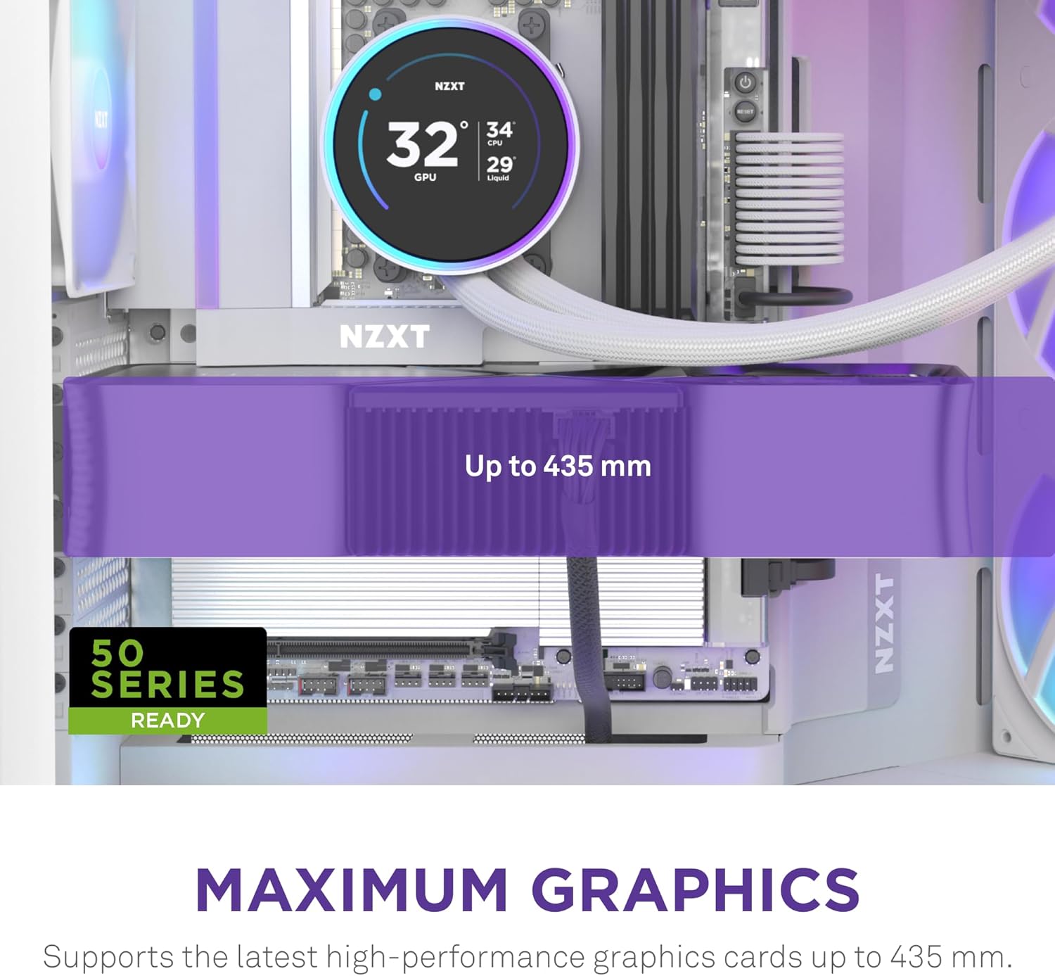 Spacious interior for large GPUs and storage devices