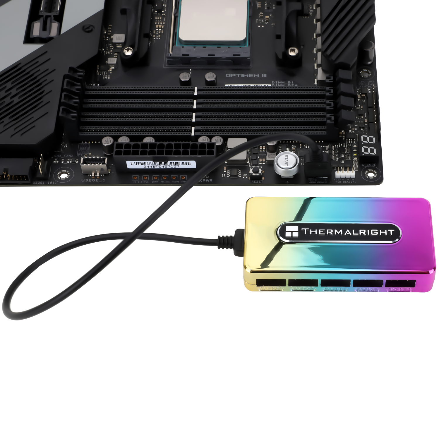 The Thermalright ARGB Hub Controller Rev.A is a compact and efficient solution for managing your PC’s ARGB lighting and PWM fans. Designed to centralize up to 10 5 V 3‑pin ARGB devices, this hub ensures stable power delivery via its SATA connector while allowing full synchronization with your motherboard’s RGB software, including ASUS Aura Sync, MSI Mystic Light, and Gigabyte RGB Fusion. Perfect for users looking to streamline cable management, expand ARGB connectivity, and maintain vibrant, synchronized lighting across multiple components. Please note: this hub distributes signals but does not create lighting effects on its own.