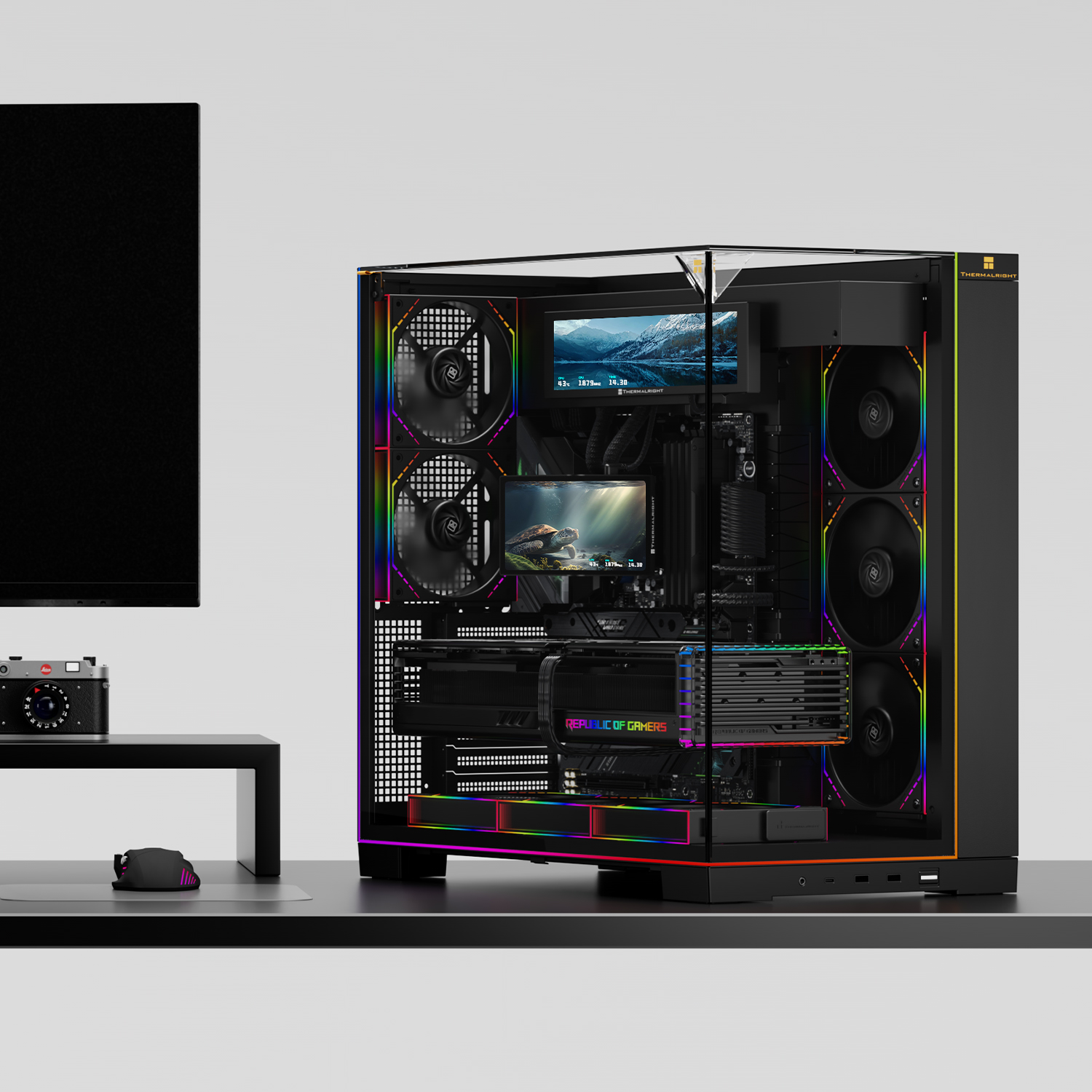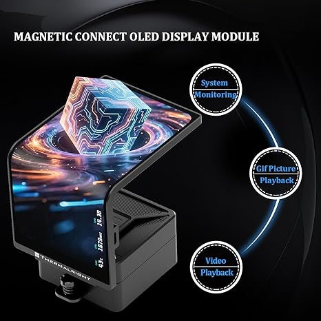 The Thermalright Levita Vision 360 ARGB Black is a high-performance AIO liquid CPU cooler designed for both AMD and Intel platforms. Featuring a 360 mm radiator and triple PWM ARGB fans, it delivers exceptional cooling for demanding workloads. Its standout feature is the 6.67‑inch 3D curved magnetic LCD screen with 2400×1080 resolution, capable of displaying 2D and 3D videos, animations, or custom visuals, letting you personalize your build like never before.