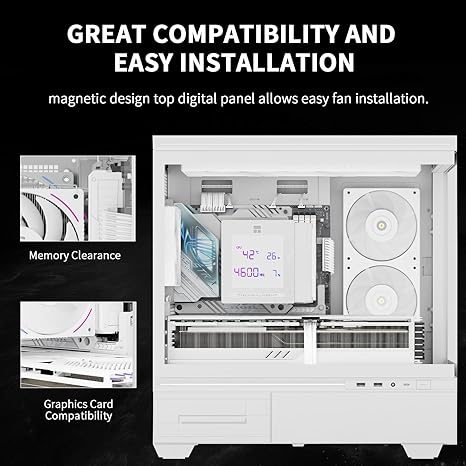 Equipped with dual 120mm PWM fans, it provides excellent airflow and low noise operation, while the magnetic digital screen top cover allows real-time monitoring of temperatures, CPU/GPU stats, and customizable ARGB lighting effects.