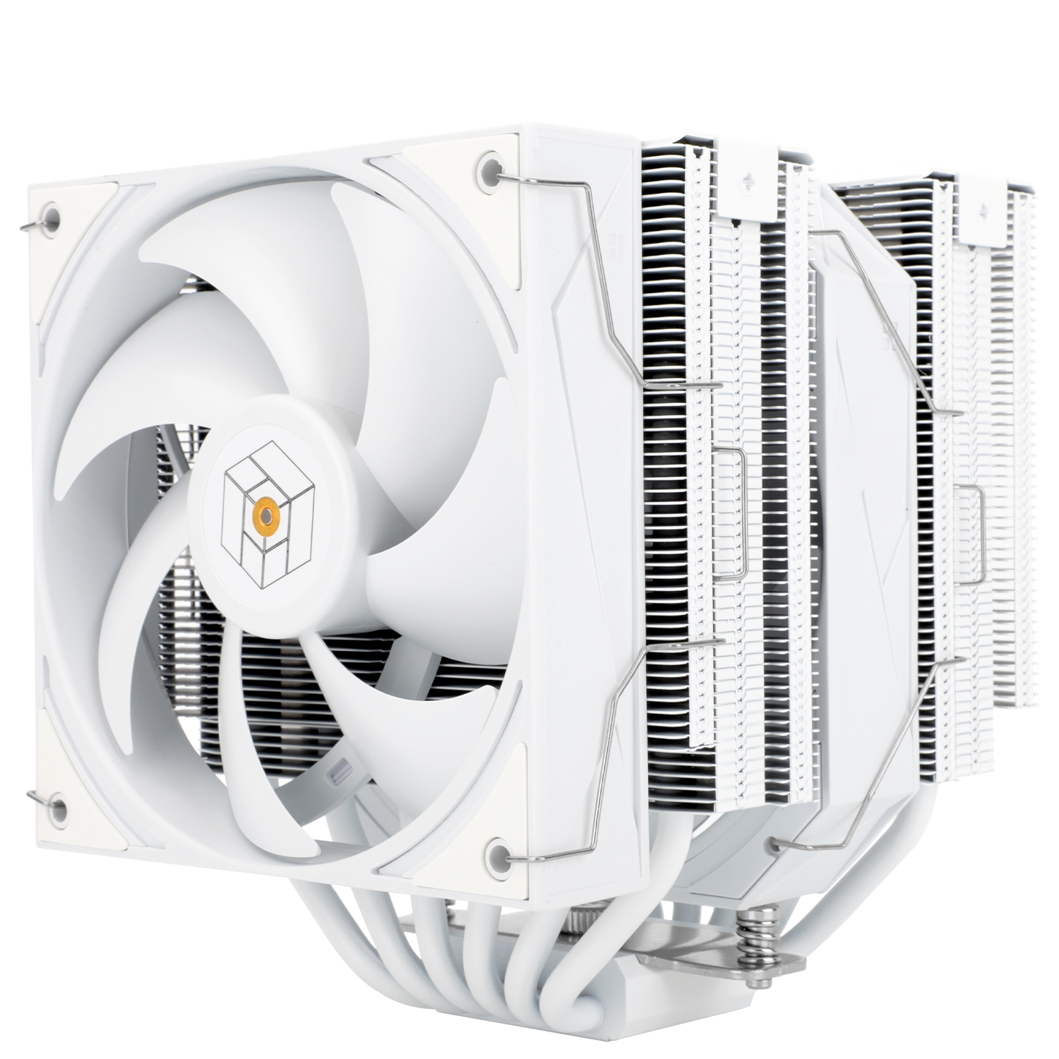 High‑performance dual‑tower CPU air cooler with six 6 mm heat pipes, dual PWM fans, and broad Intel/AMD socket compatibility in a clean white finish