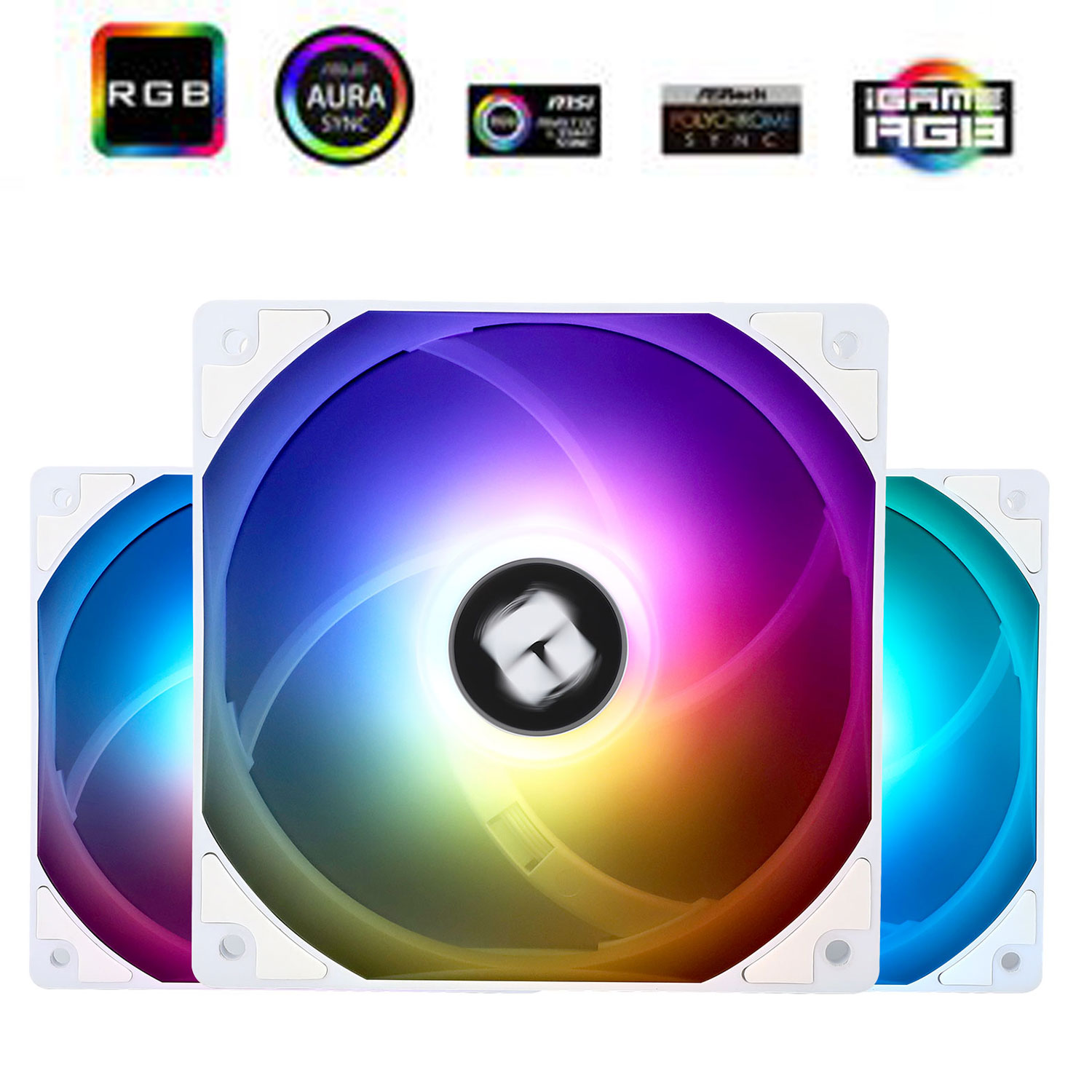 A 3‑pack of high‑performance white ARGB 120 mm PWM fans with fluid dynamic bearings, up to 1550 RPM speed and customizable lighting.
