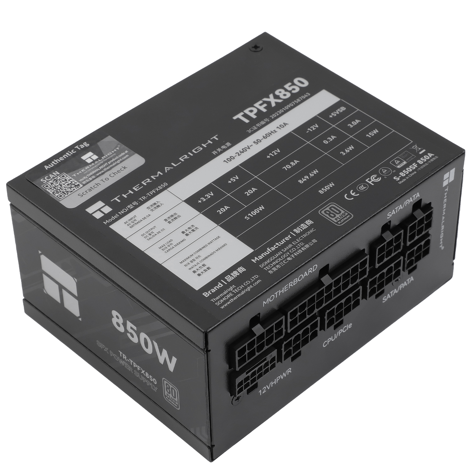 Compact high‑efficiency 850W power supply with 80 Plus Platinum certification, full‑modular design, 92 mm cooling fan, and comprehensive protection features — engineered for modern ATX 3.0 systems.