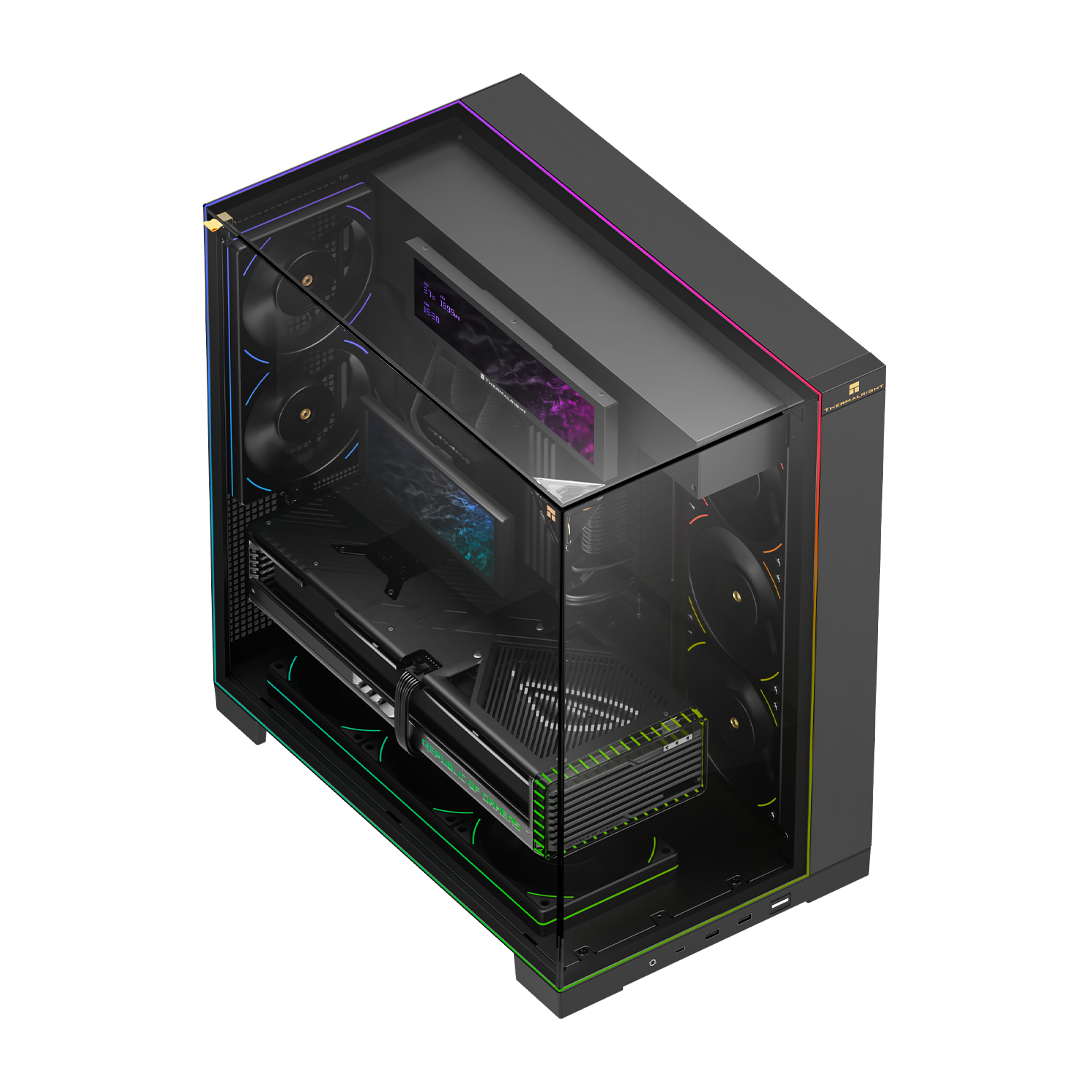 The TR A70 Vision ARGB PC Case is designed for gamers, DIY enthusiasts, and professionals who demand both style and performance. Its three-sided column-free tempered glass panels provide a 270° panoramic view of your internal components, perfectly showcasing your RGB lighting and hardware arrangement. The case is equipped with a 9.16-inch magnetic display (1920 × 480 resolution), supporting customizable themes, image/video playback, and screen mirroring through TRCC software.
